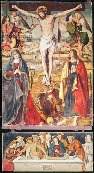 Ronzen, Antonio: Crucifixion and Entombment, central panel of the Retable of the Passion, 1517-20