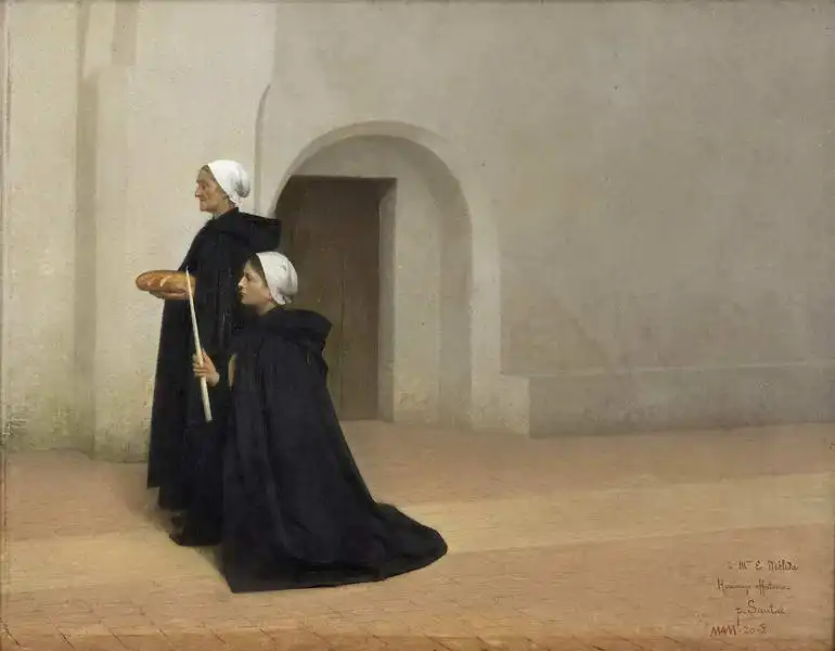 The painting depicts two women dressed in black, probably nuns, in a historical setting, as suggested by their clothing and the architecture in the background. One stands holding white bread, while the other kneels and prays. Both are draped in black robes and wear white caps on their heads. The scene gives the impression of humility and piety.