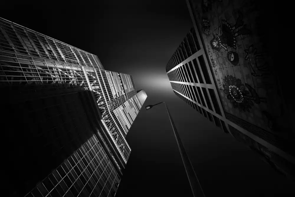 #architecture #longexposure #building #buildings #pov #perspective #bw #black and white #monochrome #skyscraper #skyscrapers #tower #towers #urban #city #cityscape #metropolis #street lamp #lamp #street light #lamps #dark #low key #low-key